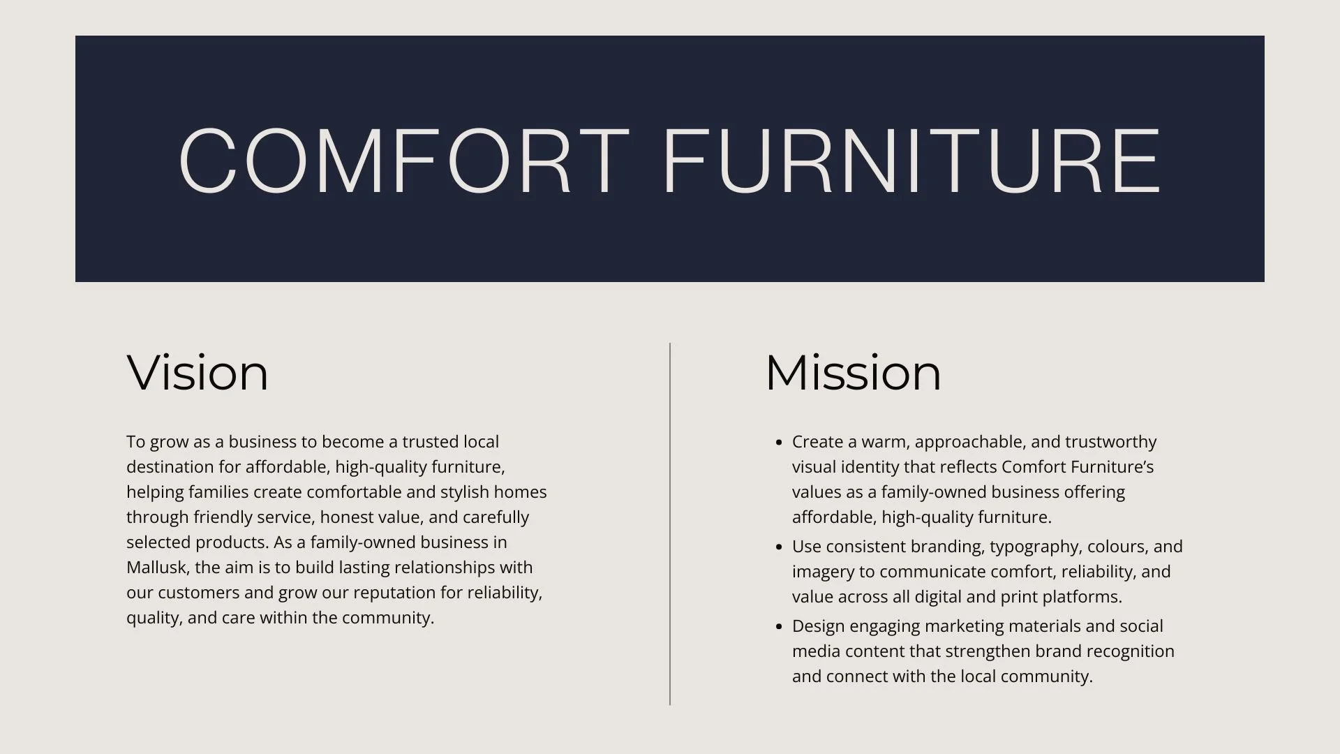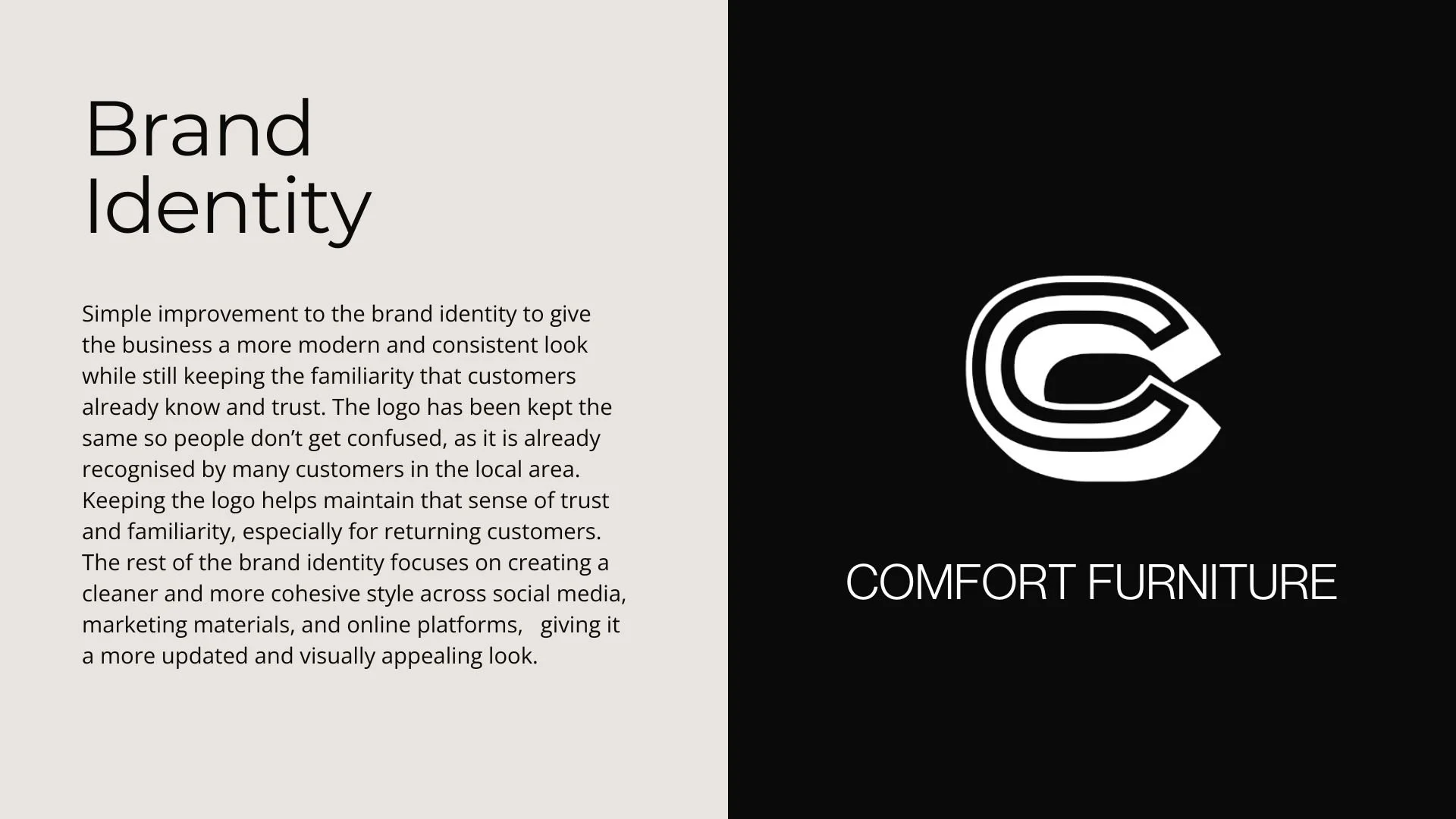 For this project, I started by researching Comfort Furniture and understanding the business as a small, family-owned furniture store that focuses on affordable, good-quality products, working alongside the team really helped me understand the company and the visions behind it. I looked at the existing branding and with the team, we decided to keep the original logo so customers would still recognise the brand and not get confused. From there, I worked on refreshing the overall brand identity by creating a new colour palette and developing a cleaner, more consistent visual style. I experimented with different layouts, typography, and design ideas before narrowing it down to the final look. The aim was to modernise the brand while still keeping the friendly and trustworthy feel that Comfort Furniture is known for.