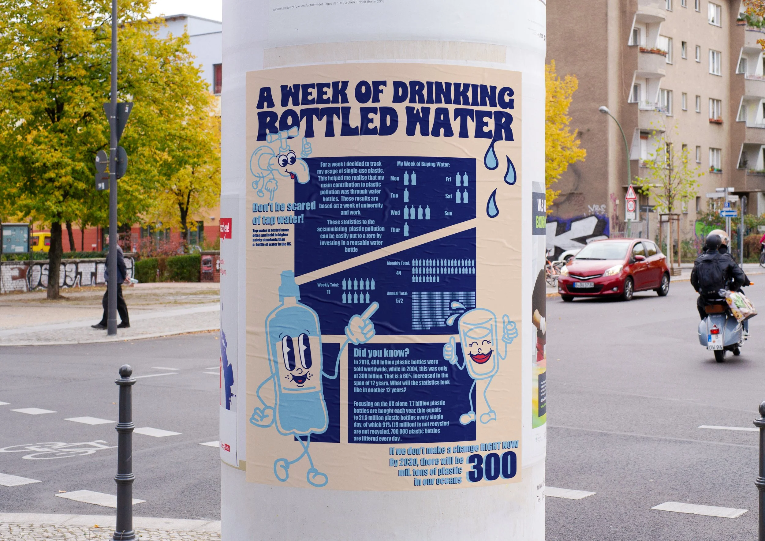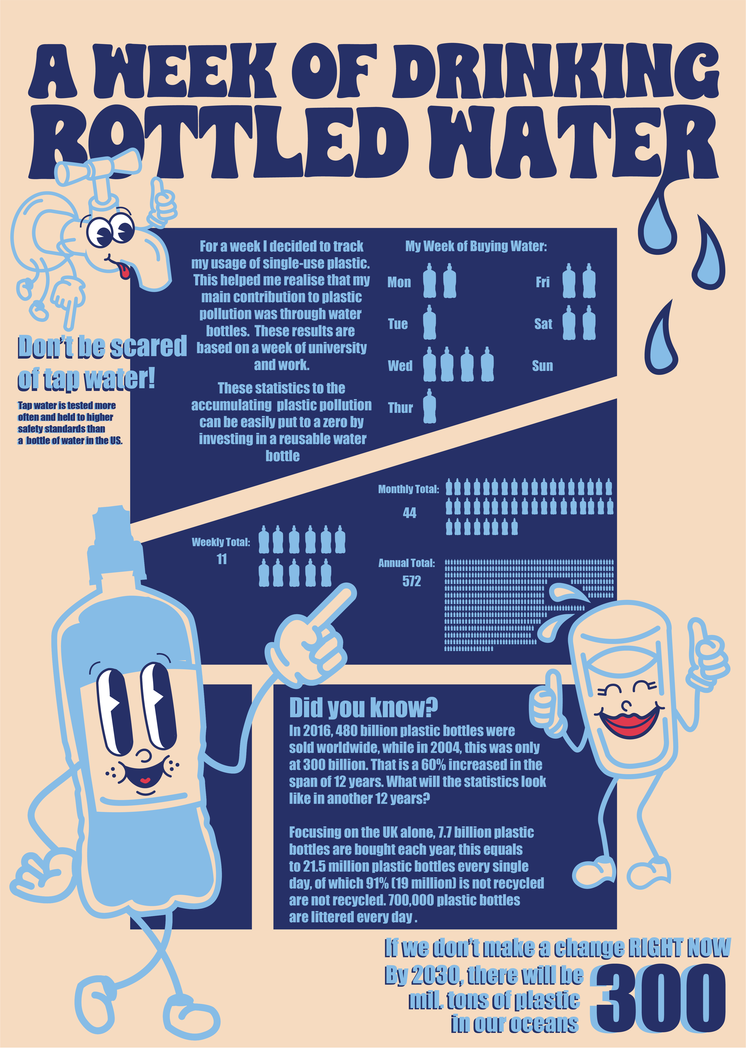 This project required me to create an infographic poster based on one of the SDGs. Using playful characters and images I was able to visualise my experience of drinking bottled water into a poster, while putting it into perspective of time to bring light to the issue of single-use plastic pollution and promoting a stop to usage of plastic water bottles, while highlighting the benefits of purchasing a reusable water bottle. This relates to the SDG 12: Responsible consuption and production.